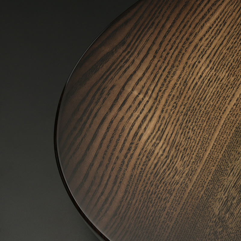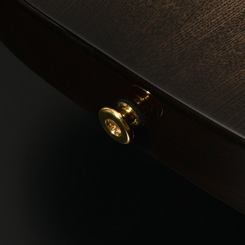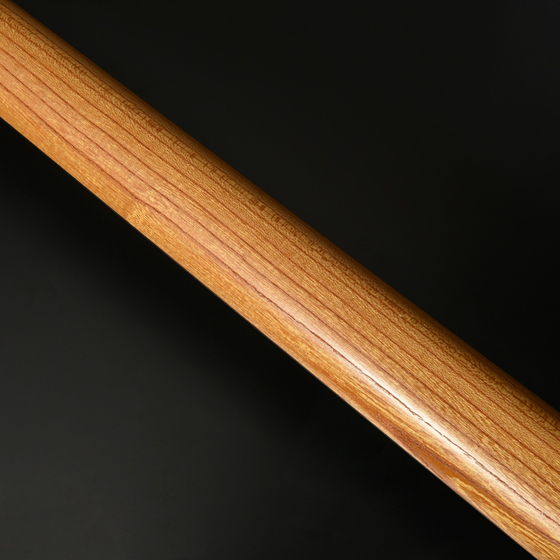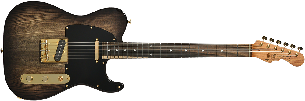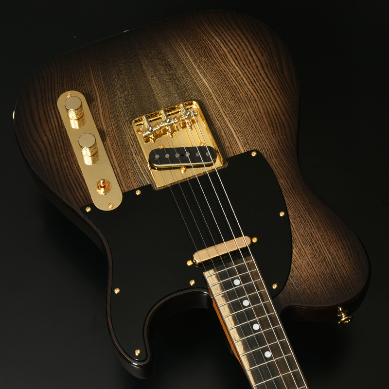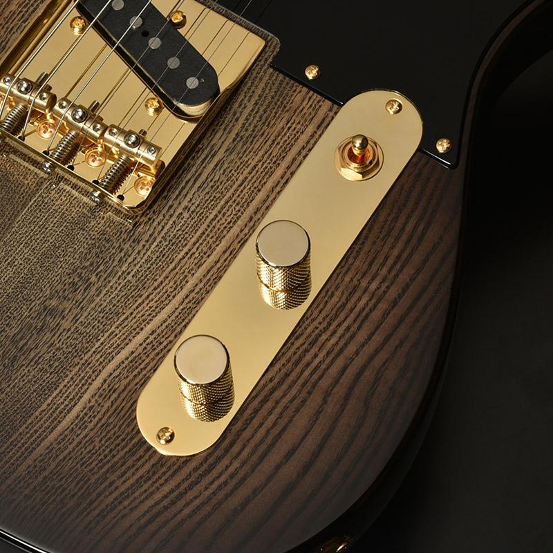 指板には、日本の銘木「黒柿(クロガキ)」を使用。黒い縞模様が現れた柿の木だけが黒柿と呼ばれ、硬質な材として知られています。ネックに用いられた欅(ケヤキ)は美しい木目と高い強度を兼ね備えた素材です。