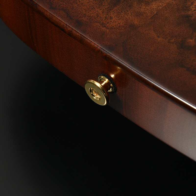 世界三大銘木の1つに数えられるウォルナットは優れた音響特性と美しい外観により、多くのハイエンド楽器に採用されている希少な銘木です。本モデルには杢目の美しいクラロウォルナットをボディトップ材に採用し、プレミアムモデルに相応しい風格を持ち合わせております。