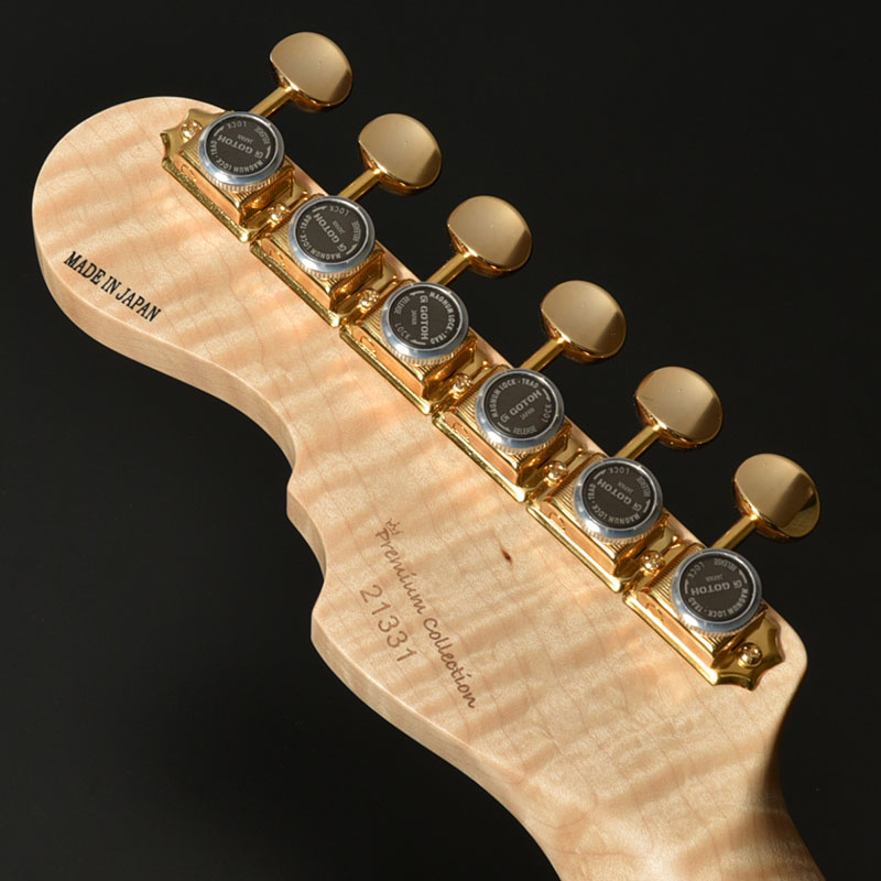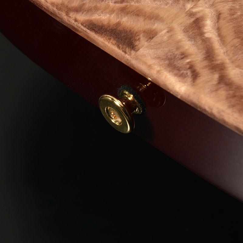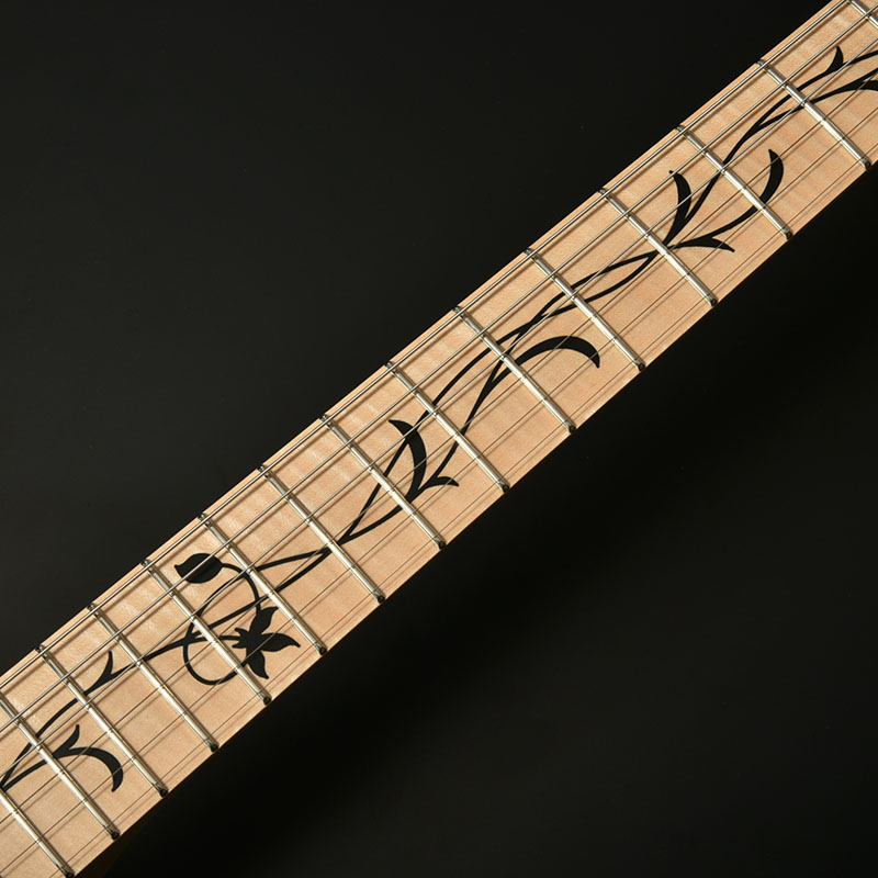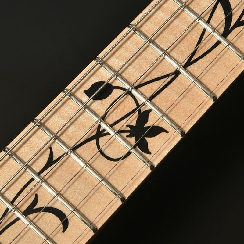 飛鳥工場の木材ストックより厳選された、ハイグレードのフレイムメイプルを指板とネックに使用。指板はツリーオブライフのインレイが施され、プレミアムモデルの象徴ともいえるゴージャスなルックスがプレイヤーの手元を華やかに彩ります。