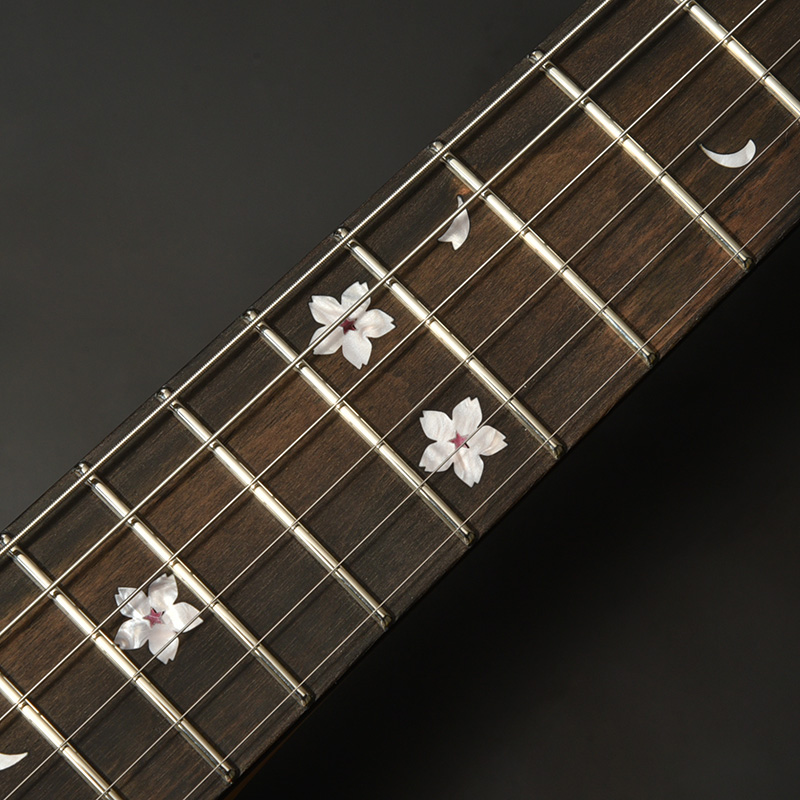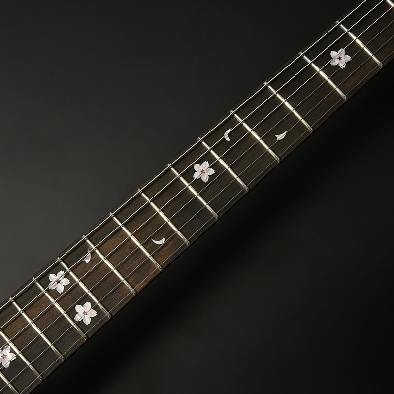 指板にはその硬さを特色とする黒柿(クロガキ)を採用。黒柿とは黒い縞模様が現れた柿の木を指し、実用性と希少性を兼ね備えた材です。ネックには同じく硬質さを材の特徴とする桜を用いており、指板の黒柿とともに日本の木材による仕様としています。
