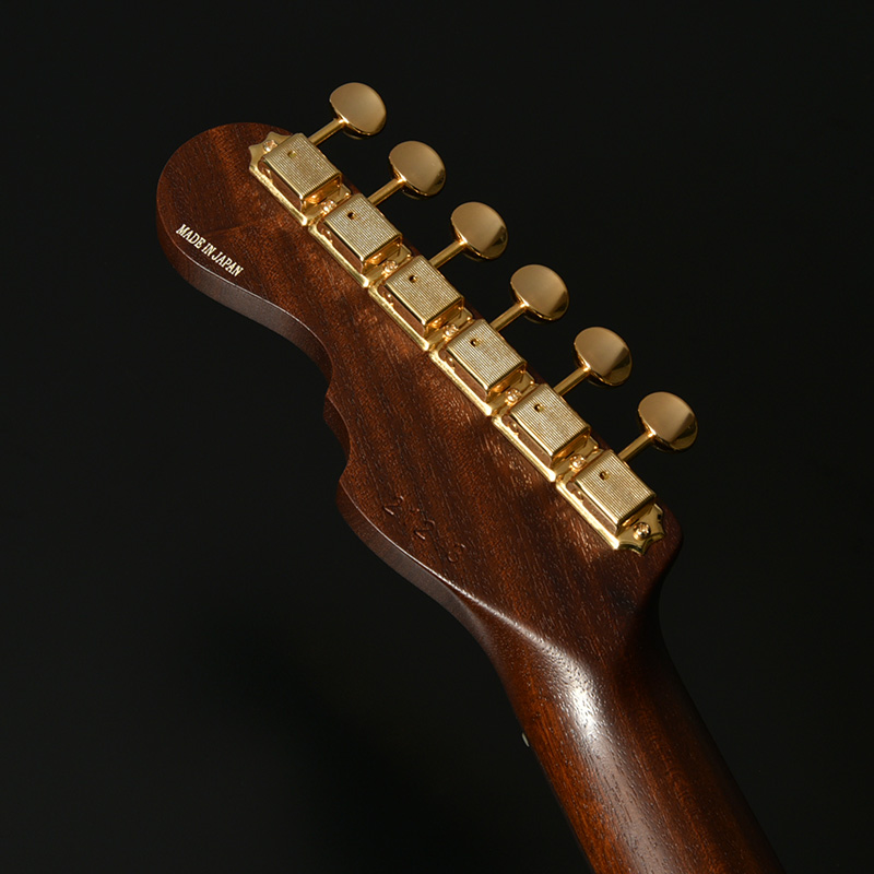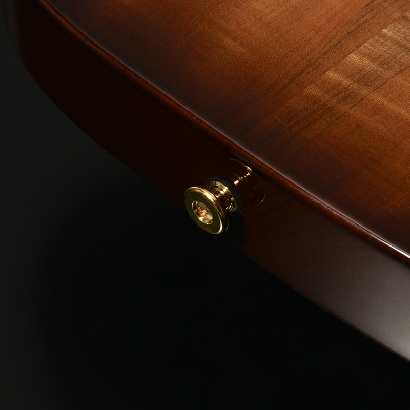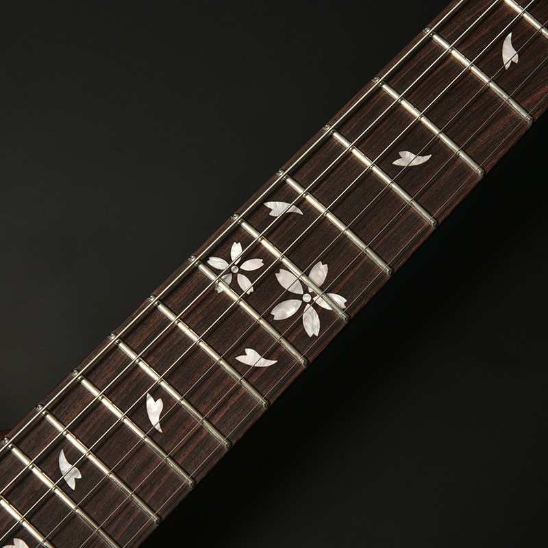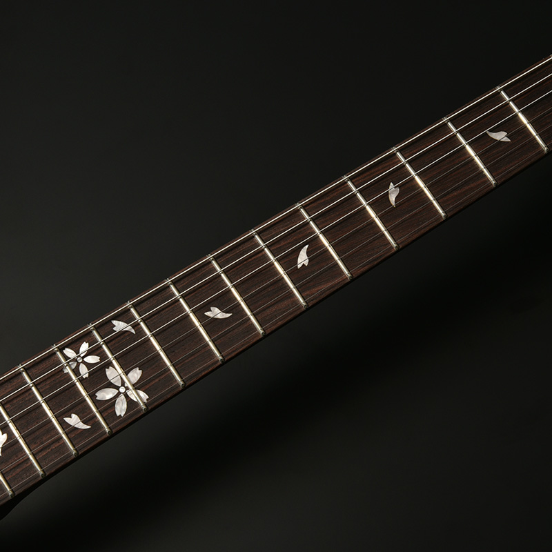 指板には桜の花びらを模したインレイを埋め込んでいます。宙に優しくそよぐ桜の花がローズウッドの指板に表情を与え、桜モデルとしての個性を際立たせています。