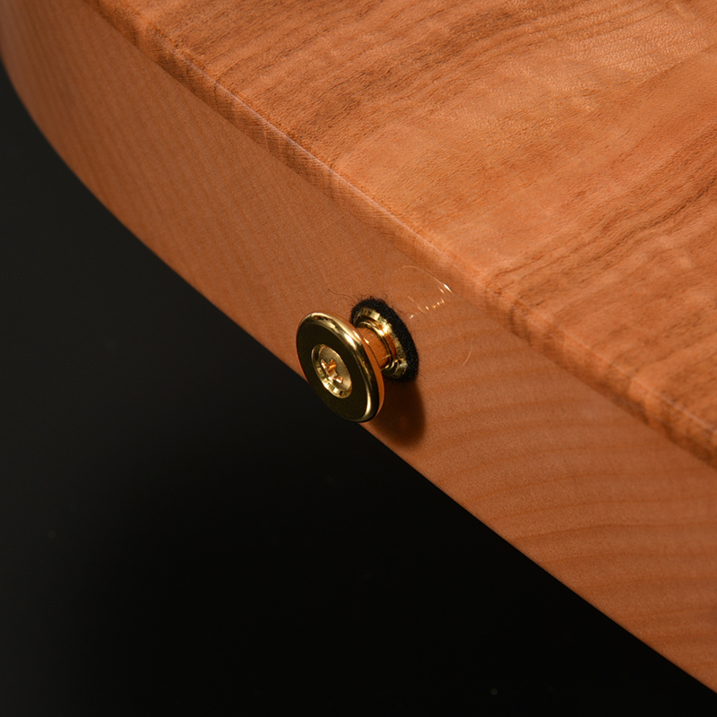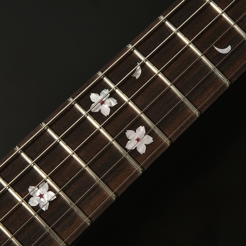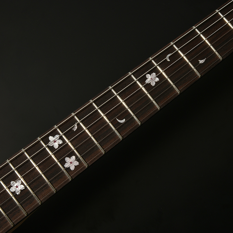 指板上のインレイには花を大きく開いた桜の花びらと散りゆく花をデザイン。天然貝が持つ色合いにより、ひとつひとつ異なる桜の表情をお楽しみいただけます。