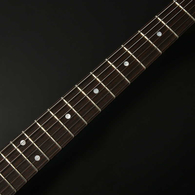 紫檀(したん)の和名を持つローズウッドの一種「インディアンローズウッド」は最もスタンダードな指板材のひとつであり、サウンド面でも実用性の高い仕様となっています。