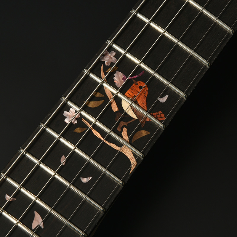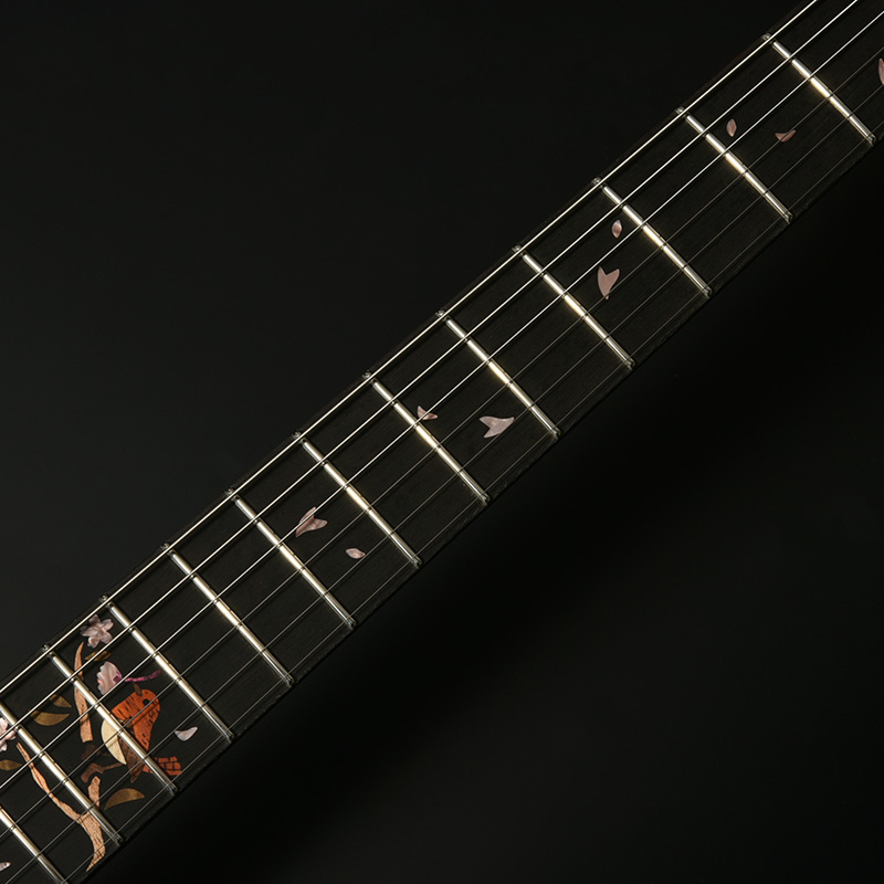 指板にも巧みなインレイワークにより、舞い落ちる桜を色彩豊かに表現。桜の枝には奈良県の県鳥であるコマドリがデザインされています。