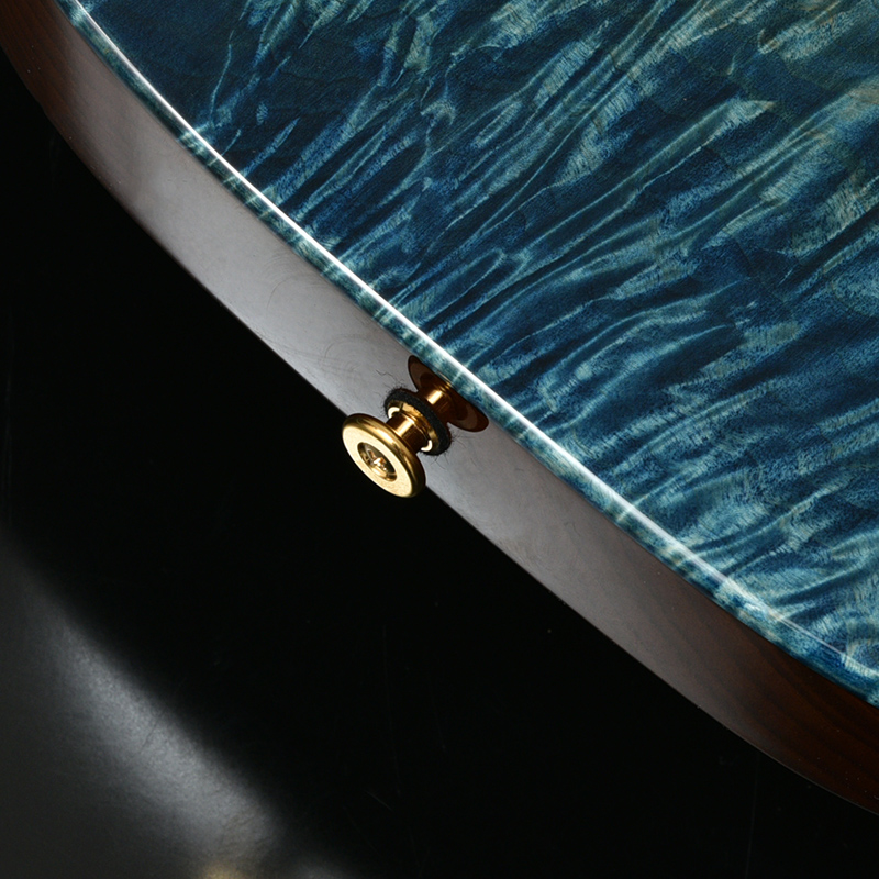 1弦側ホーンの淡く青がかったブルーカラーからエルボーコンター付近の深い青色にかけて、徐々にグラデーションしていく姿は浅い滝口から深い滝壺にかけて激しく流れ落ちていく大瀑布のような威圧感をも感じさせます。