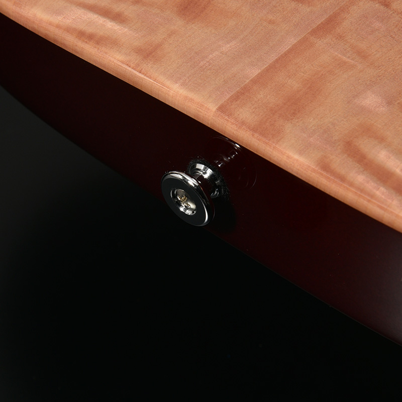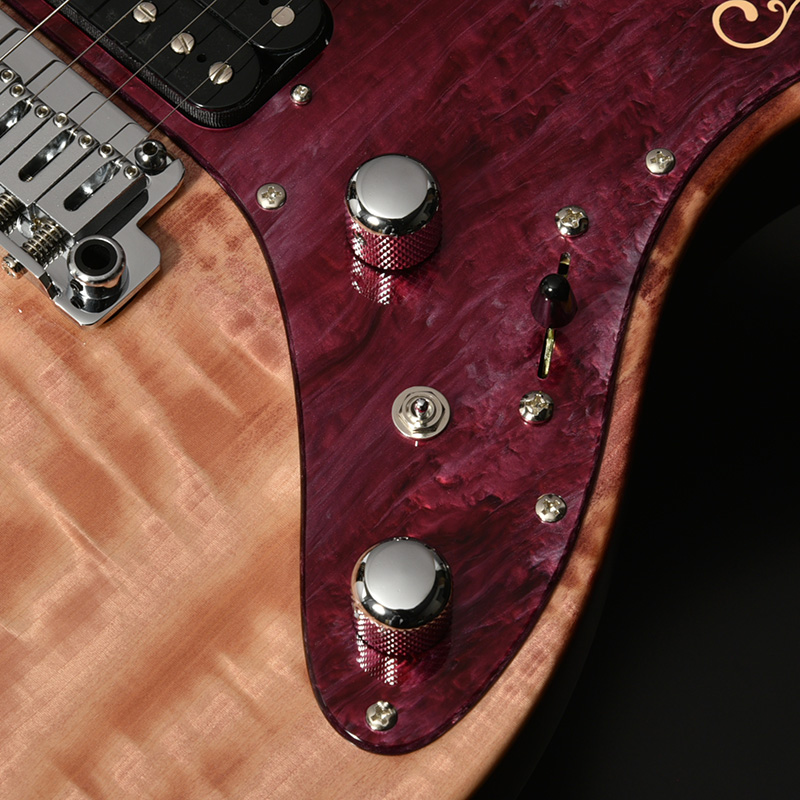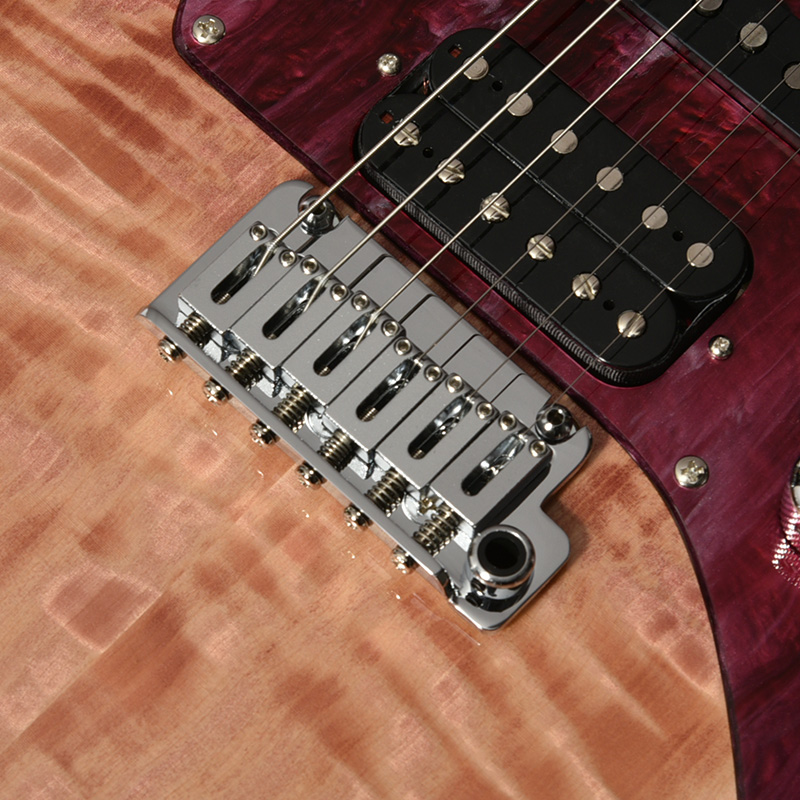 和材として人気の高いトチ材をボディに使用した一本です。トップ材には美しいフレイム杢目を有した個体を選定し、バック材にも同じくトチを採用しています。中~高音域に特徴のある抜けの良いサウンドを持ち、オーバードライブをかけた際の歪の乗りも非常に良く、その音響特性を発揮して様々なジャンルに対応可能です。