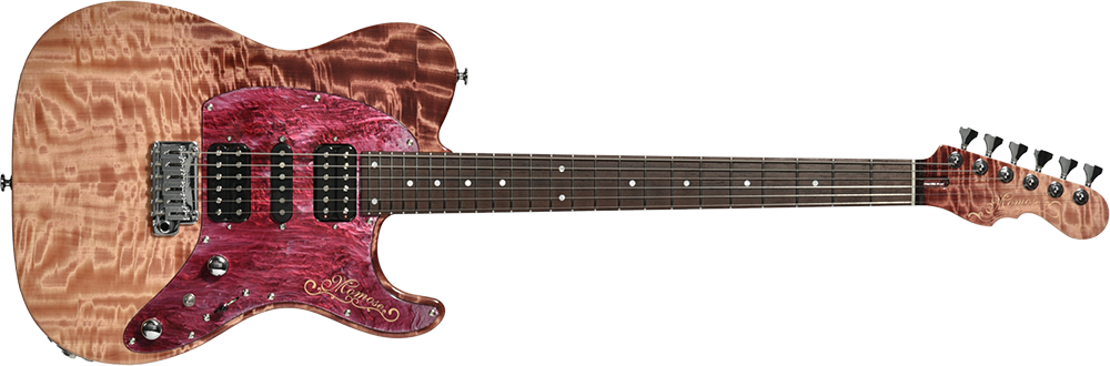 “Red Collection”に合わせて製作された本機のカラーリングは、Vintage Wine Redと名付けられました。文字通り年代物のビンテージワインを思わせる、くすみを帯びた味わい深い赤を表現しています。マッチングカラーのアクリルピックガードとの組合せにより、ギター全体を通して美しい赤の表現を目指しました。