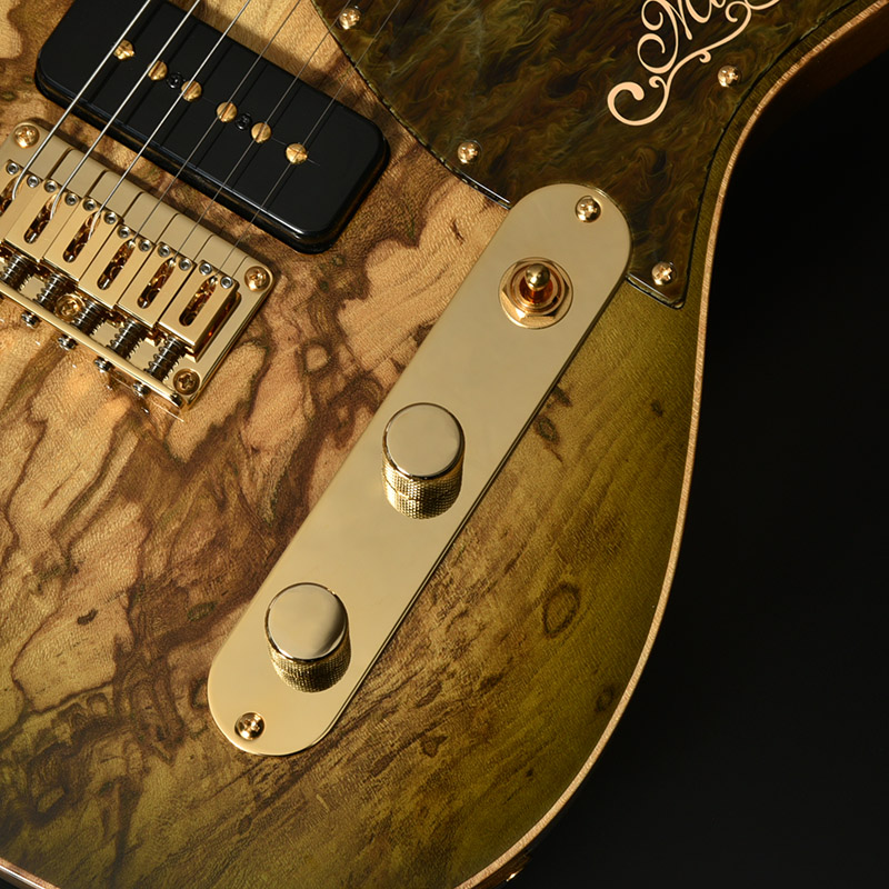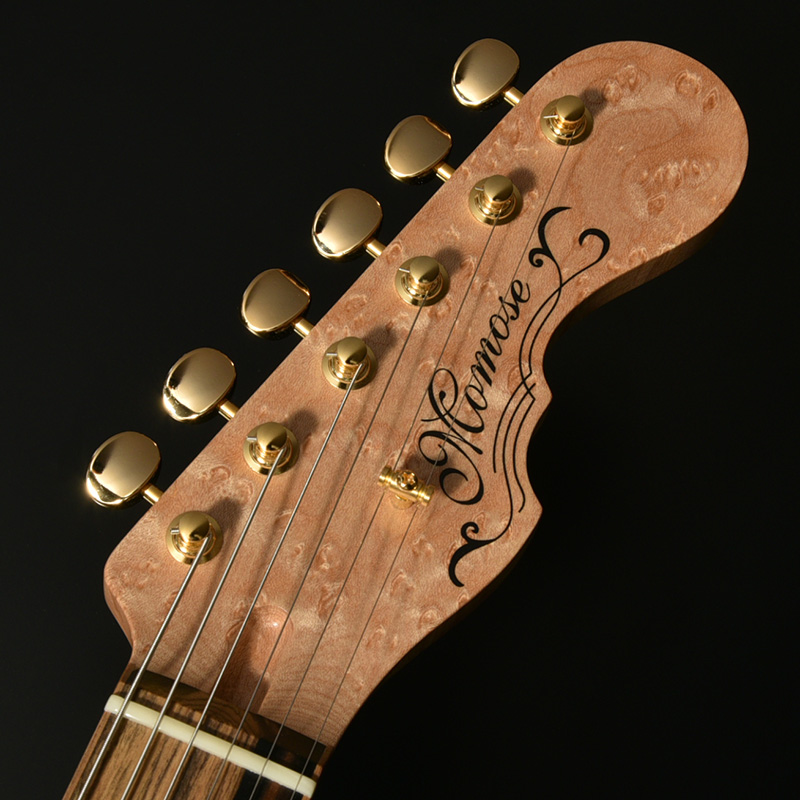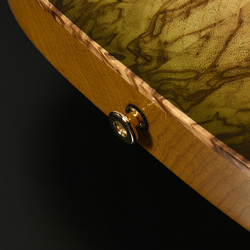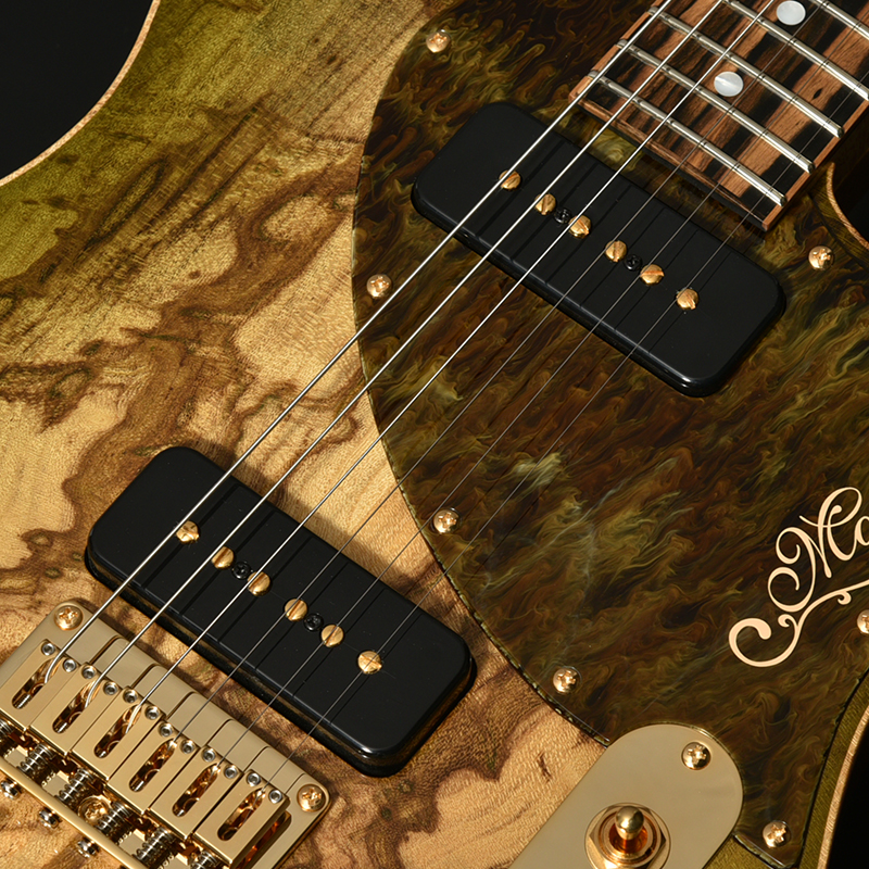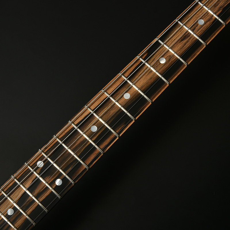 指板材にはペールムーンエボニーを使用。定番のローズウッドなどに比べて重量があり、音の立ち上がりが早く輪郭のあるトーンと伸びやかなサスティーンを生み出します。ネックには本イベント用に厳選されたバーズアイ・メイプルを採用。ハードメイプル種の中でもごく稀に見つかる希少性の高い木材で、自然が生み出したその装飾には唯一無二の美しさを感じさせられます。