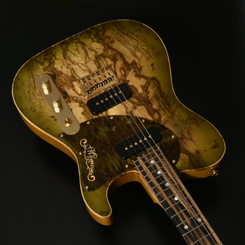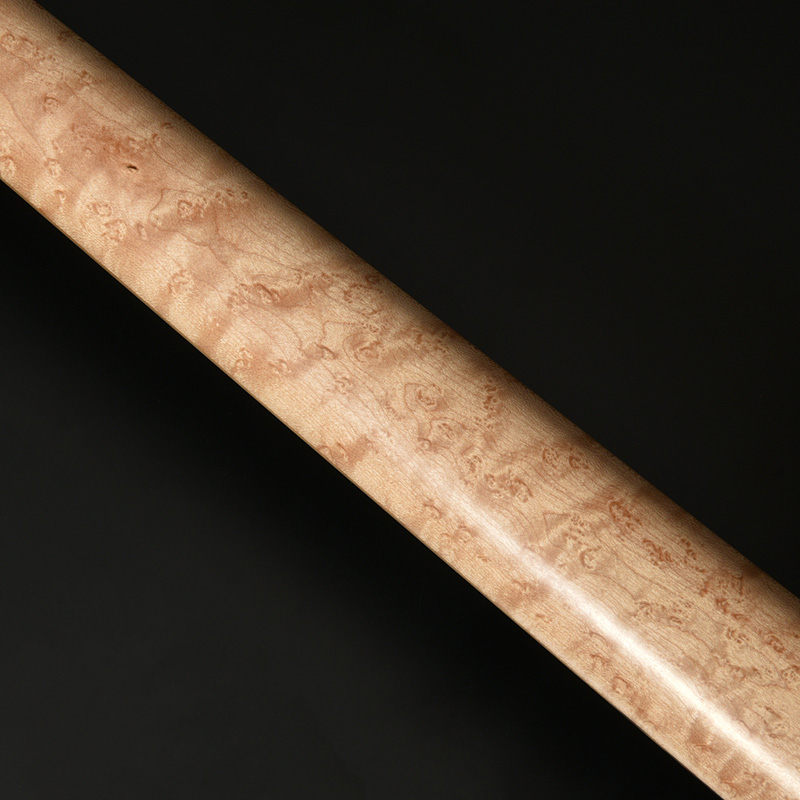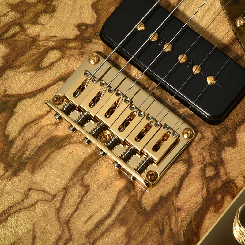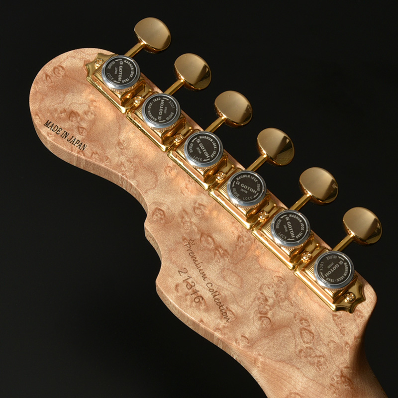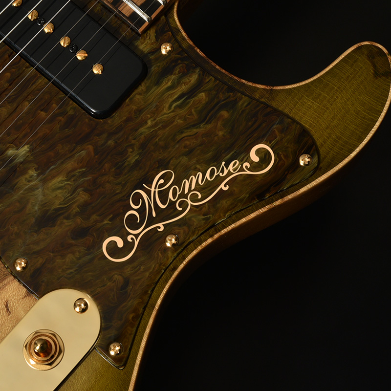 指板材にはペールムーンエボニーを使用。定番のローズウッドなどに比べて重量があり、音の立ち上がりが早く輪郭のあるトーンと伸びやかなサスティーンを生み出します。ネックには本イベント用に厳選されたバーズアイ・メイプルを採用。ハードメイプル種の中でもごく稀に見つかる希少性の高い木材で、自然が生み出したその装飾には唯一無二の美しさを感じさせられます。