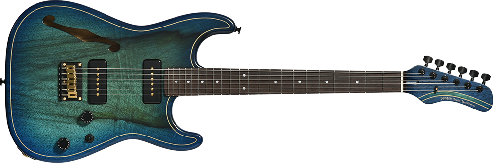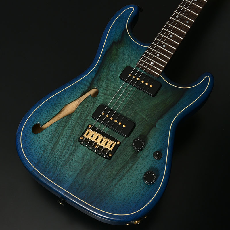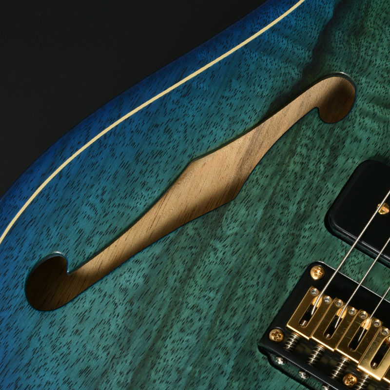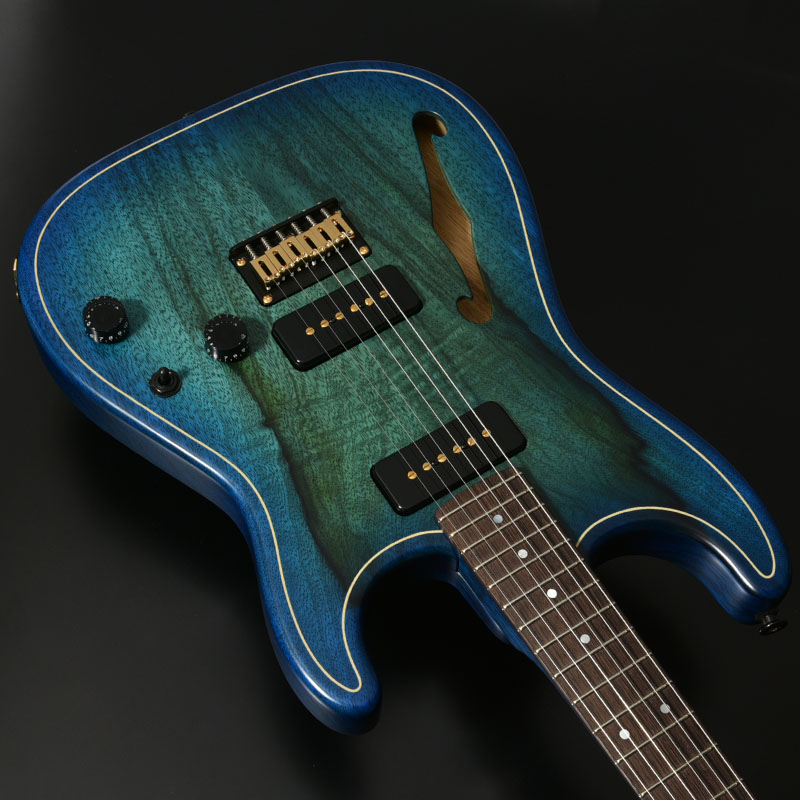 トップにFホールを備えたセミホロウボディ、プレイアビリティに優れた25インチスケール等をモデルの特徴とする「ROSETTA VESSEL(ロゼッタヴェッセル)」がプレミアムコレクションに登場。ボディ材にはハイミッドにかけて抜けの良いサウンドを持つ、黒模様の入ったコリーナ材「ブラックコリーナ」を採用しています。