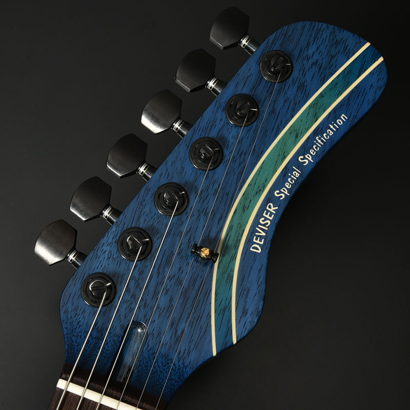 ヘッドストックには素朴な手書き風のオリジナルロゴと、ボディトップと同じ木材を使用したワンポイントがデザインされます。