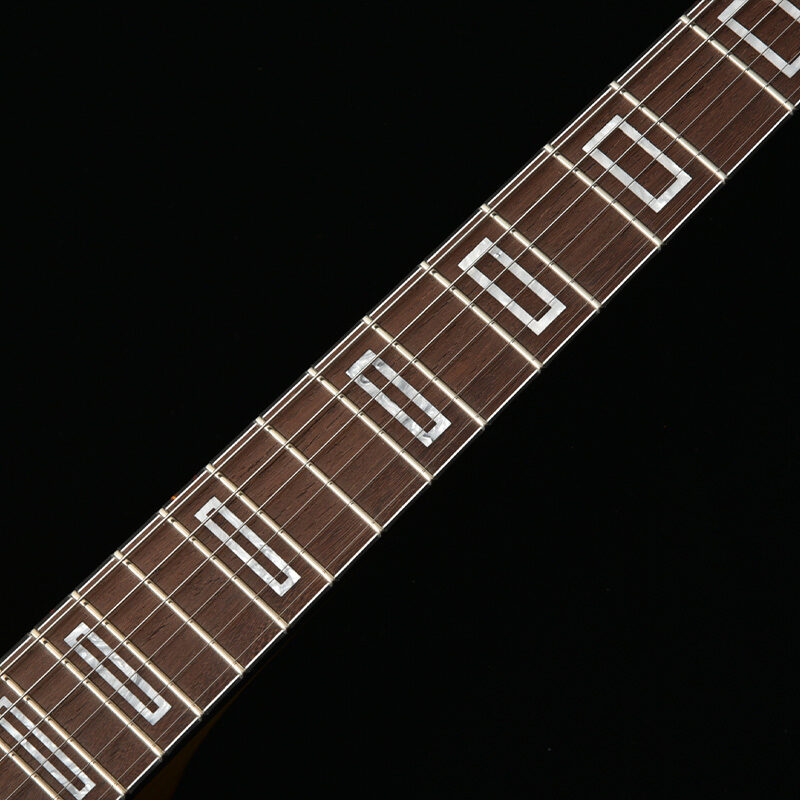 ポジションマークにはすっきりした印象のオリジナルデザインを採用。彫刻機により指板を加工し、一つずつ手作業でポジションマークが埋め込まれます。指板やボディ外周のバインディングとも調和し、洗練された印象へと仕上がりました。