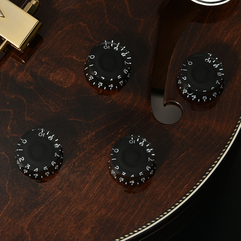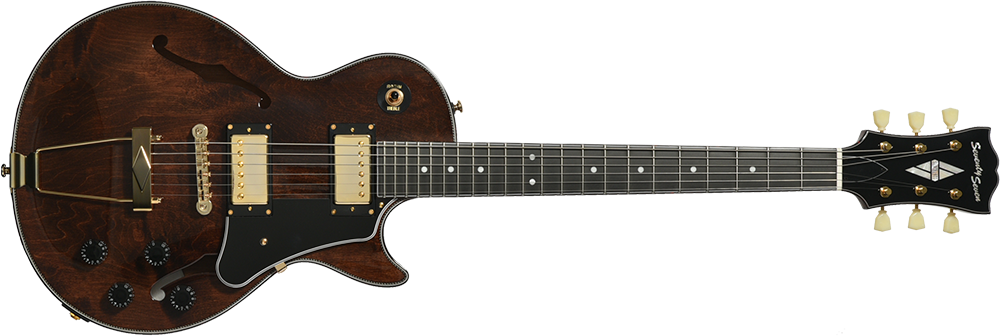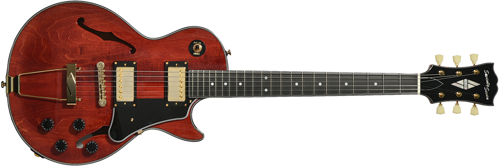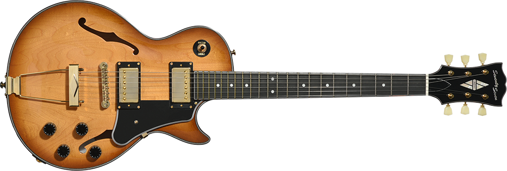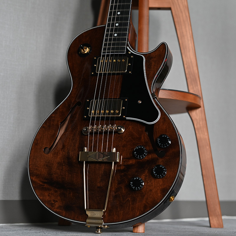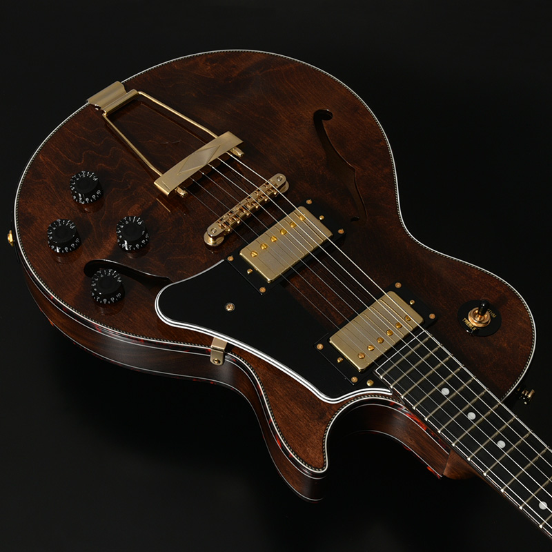 ボディトップにはプレーンメイプルを採用し、バック材にはマホガ二ーに似た音響特性で知られるアフリカ原産のオクメ材が使用されています。セミホロウモデルながらエレキギターに求められる芯のあるサウンドも持ち、Jazz以外のジャンルにも対応可能です。