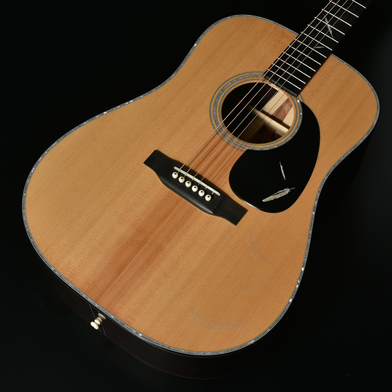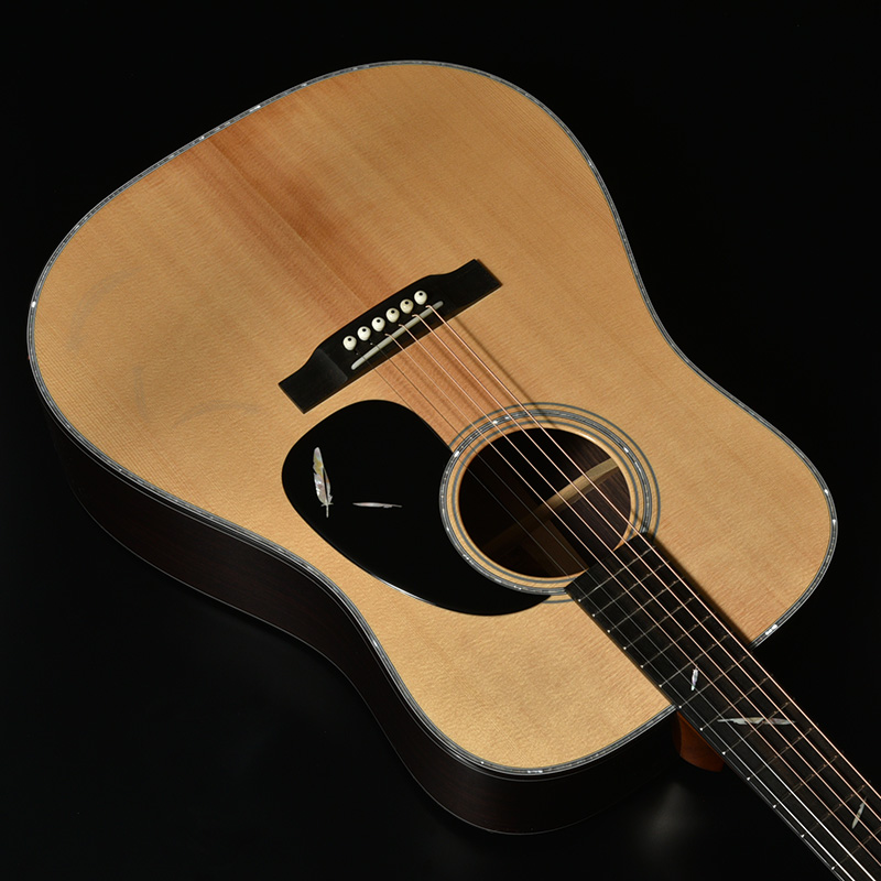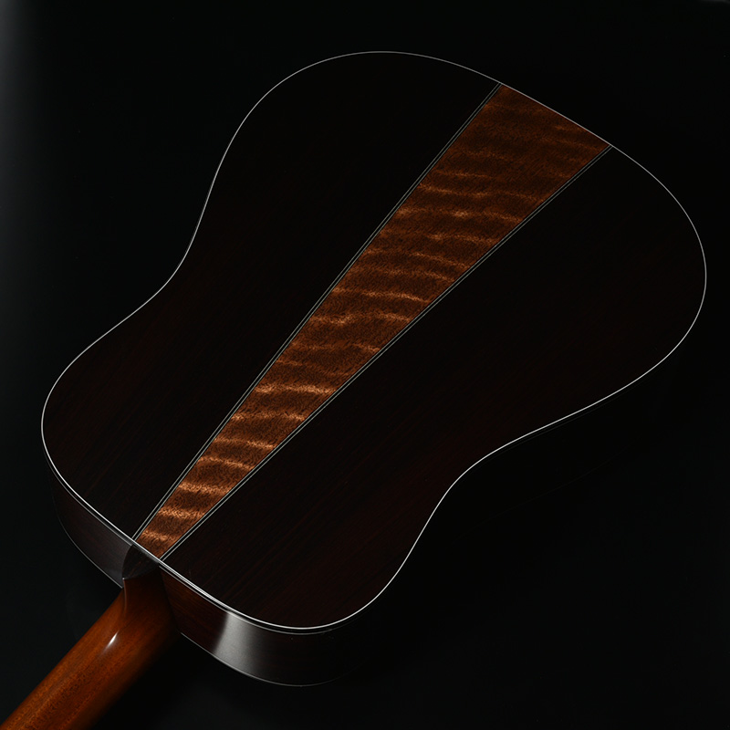 40年以上の時を経た80’s Sitka Spruceと、上質なIndian Rosewoodを組み合わせ、さらに本モデルの個性として、ボディバックセンターにPremium Flame Mahoganyを使用しています。