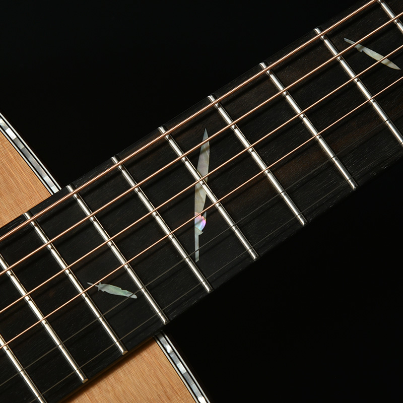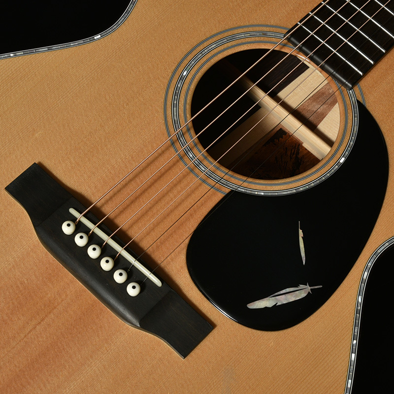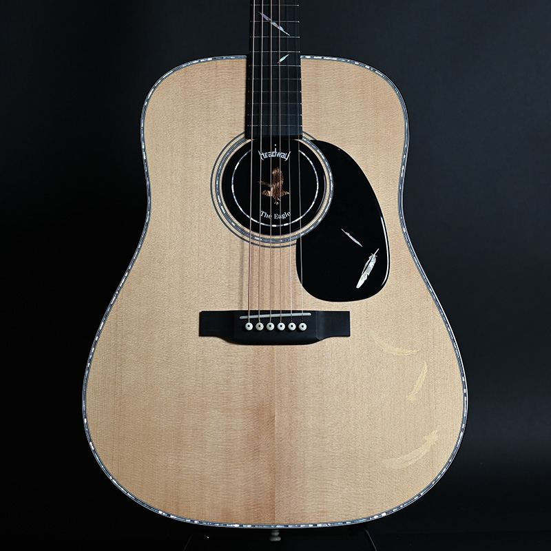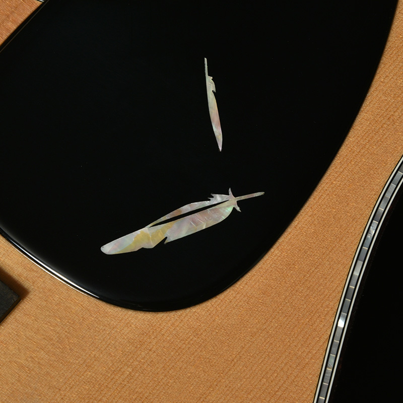 ピックガードにもイーグルフェザーのインレイが施されており、舞い落ちる羽が指板からピックガード、そしてボディトップへとつながる一連の流れが、ギター全体のデザインとして表現されています。